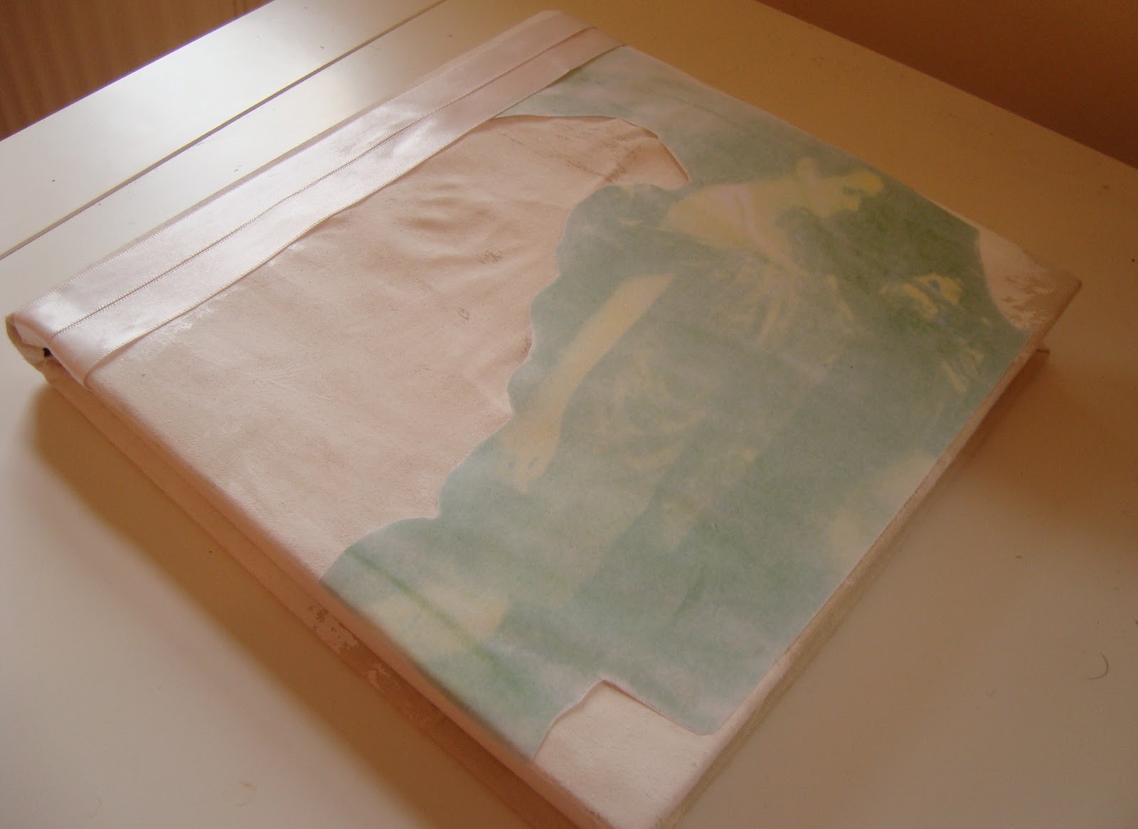 Instead of buying a new notebook for next term, I thought i'd just make one myself! I covered a blank spare sketchbook I had in some material that I painted with white emulsion and printed an illustration that I'm fond of which I did during my time at Vivienne Westwood. It features the model wearing a Red Label golden taffeta cocktail dress which I loved.